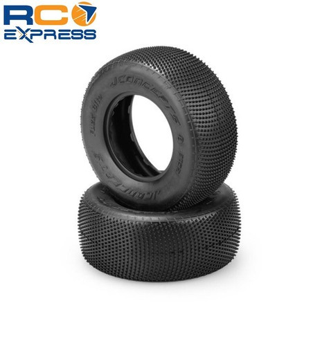 The team at JConcepts are always innovating and adding to an arsenal of fine racing tread patterns and compounds. The carpet and turf racing scene are hotter than ever, and with more courses, the team works harder than ever to deliver more options to a hungry crowd of racers. Introducing the Fuzz Bite for the SCT trucks, the pin tire designed with radius positioning to enhance the drive on a range of surfaces. The Fuzz Bite lands on a JConcepts SCT carcass carried over from already successful tires in the line-up. The SCT stance provides quick transition at high-speed and minimizes side-wall deflection and roll due to internal sidewall ribbing. The pin is specially built in a reverse "water tower" shape planting the larger base at the bottom and narrowing at the top for precision. The pins are placed in a radius and repeated about for a healthy nest of pins to dig deep into matting in office carpet or tight knit CRC carpeting. The alternating rows of pins provides side-bite, and the tightness gives forward traction. The arrangement of the pins promotes good wear characteristics and traction longevity. The Fuzz Bite incorporates a small radial rib on the outside with angular cross to give consistent cornering but also forward mid-corner launch grip. Inside the carcass, heavy sidewall ribs on the outside help support heavy corning, allow to brace against the wheel and built to work in conjunction with included foam inserts. A unique feature on the Fuzz Bite is the scalloped tire bead which removes a lot of weight from a normally beefy area. The tips of the bead touch off on the inner beads on the wheel which lead to a great alignment but now with reduced rotating weight. During the gluing process, it is also handy to have some breathing room for the glue process and the geometry gives many edges and ledges to adhere to.